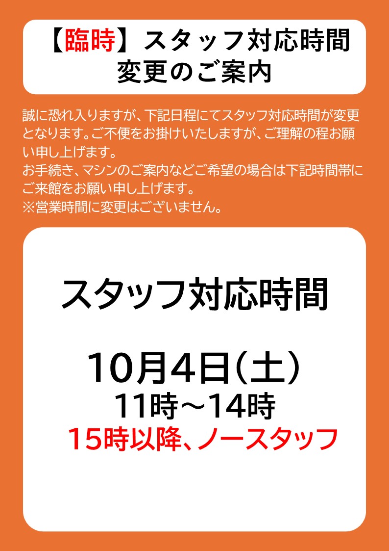 3FIT長浦【臨時】スタッフ対応時間変更のご案内