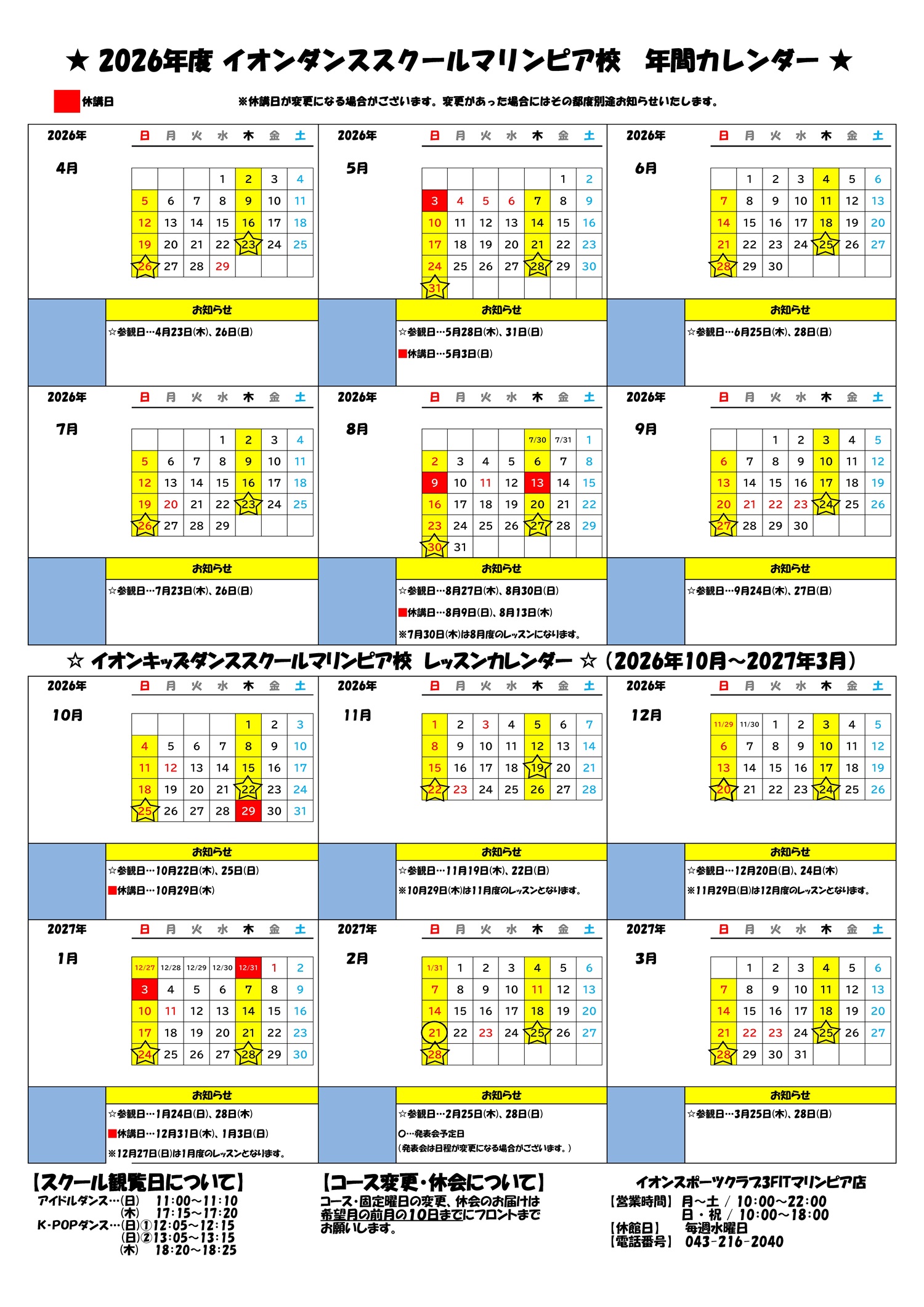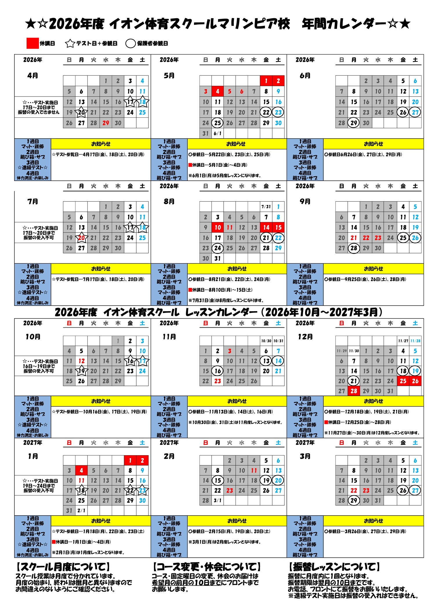 3FITマリンピア店 2026年度 キッズスクールカレンダー
