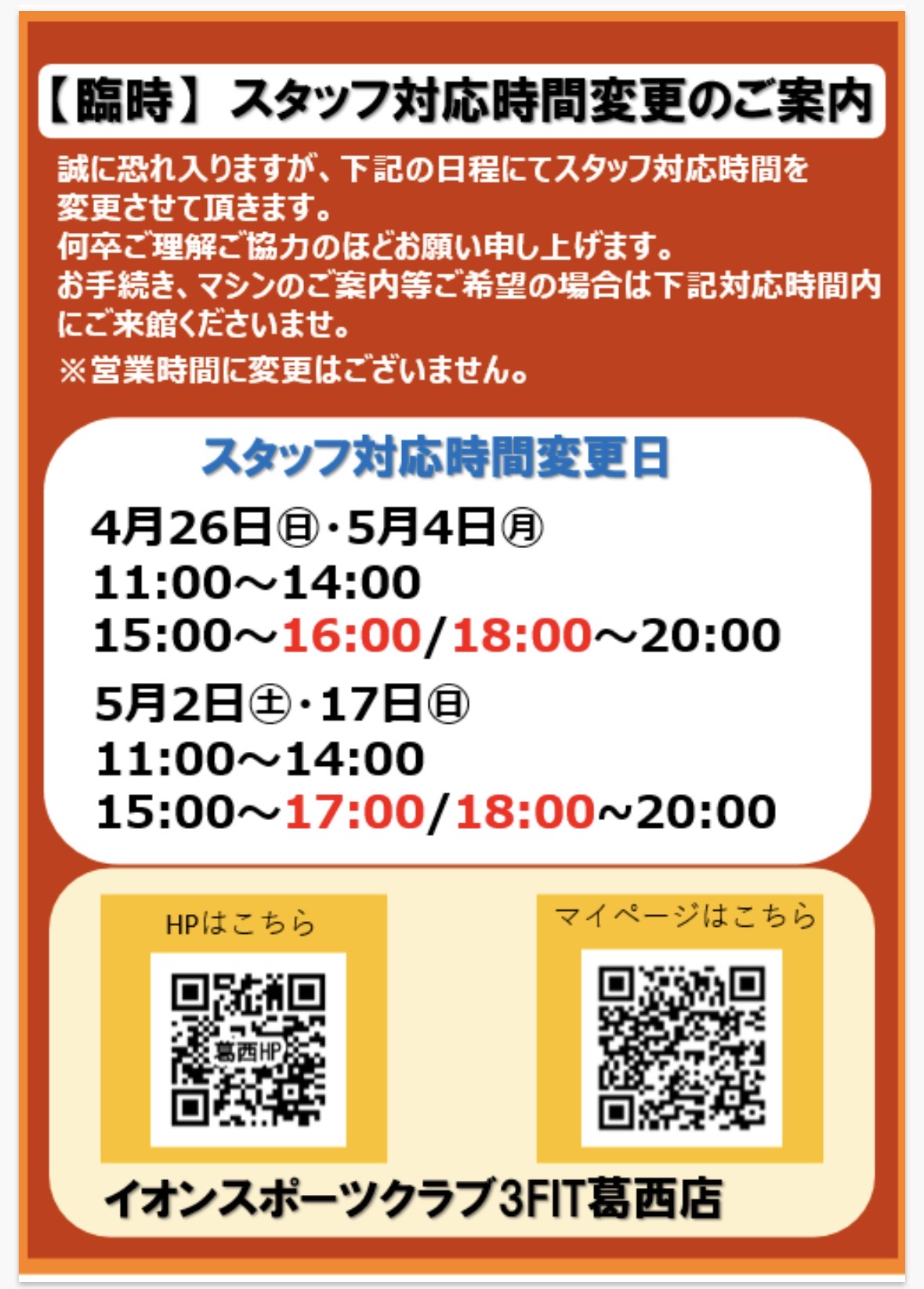 3FIT葛西【臨時】スタッフ対応時間変更の件