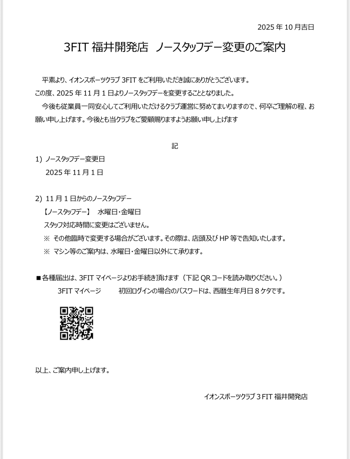 3FIT 福井開発店 ノースタッフデー変更のご案内