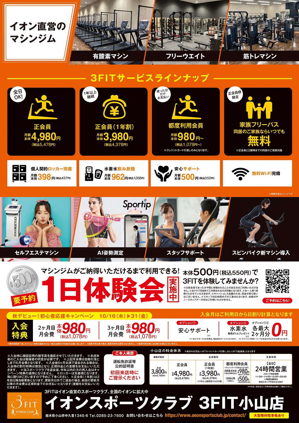 『イオンスポーツクラブ 3FIT小山店』は、マシン特化型ジムでダイエットや健康維持に最適で初心者にも安心のサポート体制が充実。