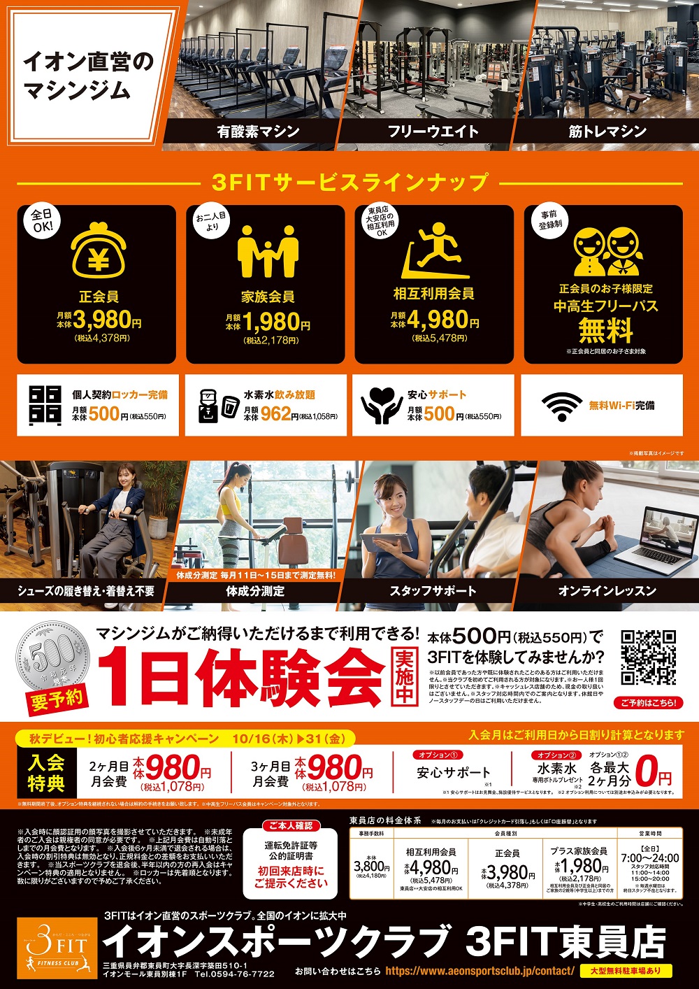 『イオンスポーツクラブ 3FIT 東員店』は、イオンモール東員別棟1階にある圧倒的低価格のマシンジムです。