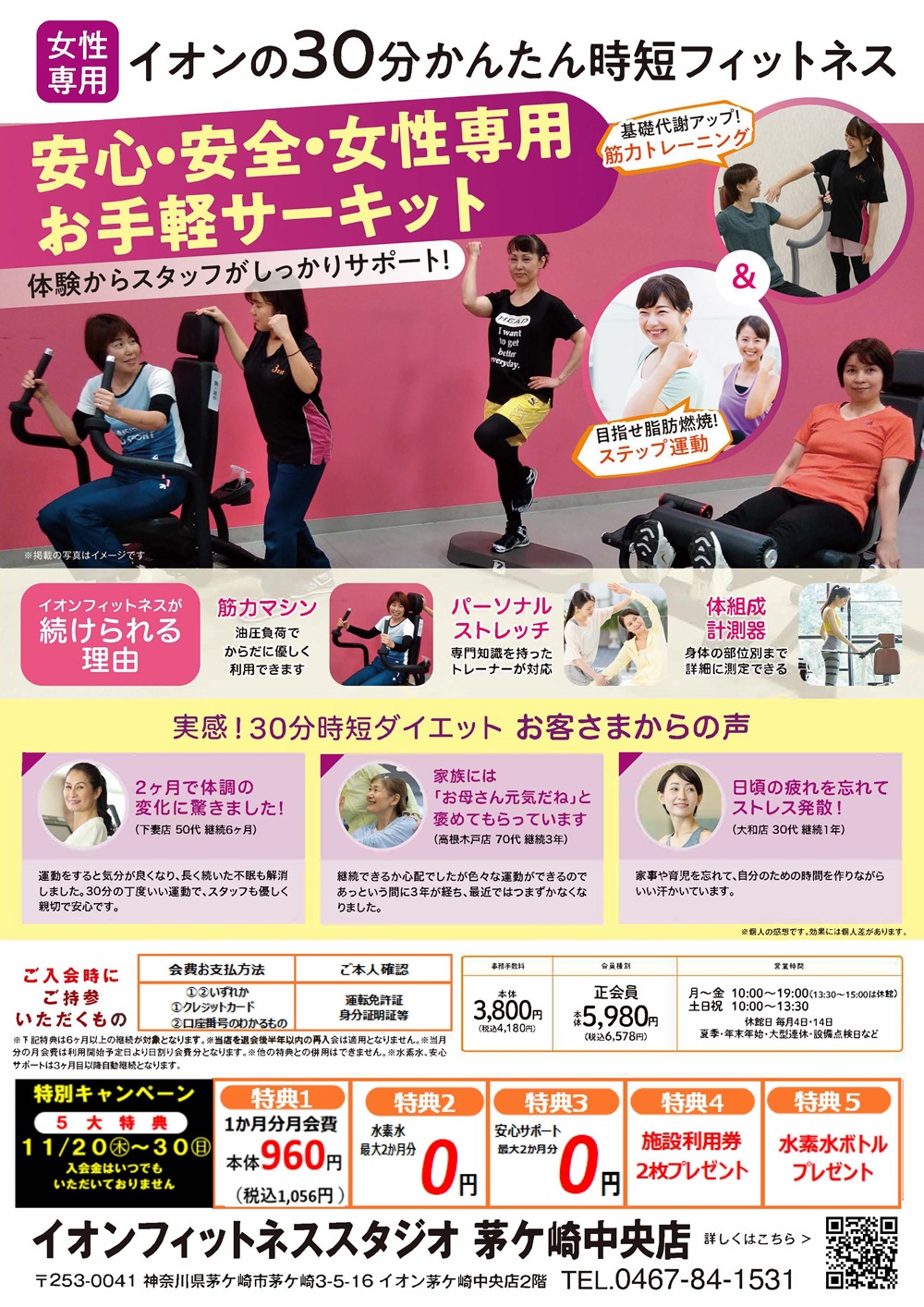 イオンフィットネススタジオ 茅ヶ崎中央店はイオン茅ヶ崎中央店内にある初心者でも安心して気軽に行える女性専用の30分サーキットトレーニングスタジオです。