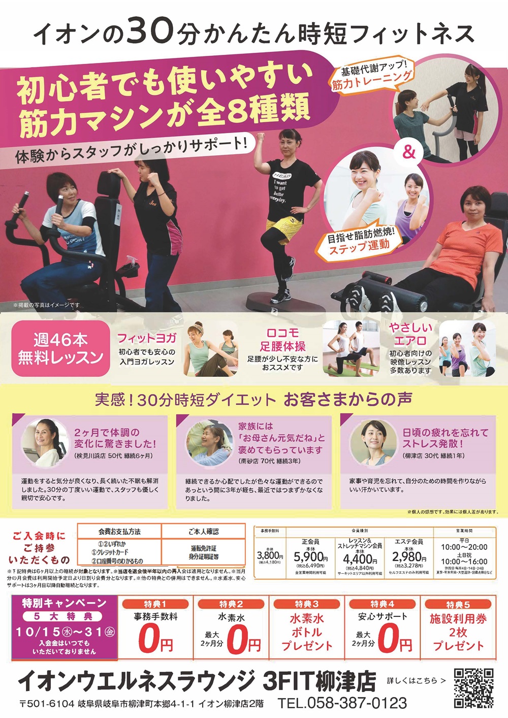 イオンウエルネスラウンジ 3FIT 柳津店はイオン柳津店内にあるサーキットトレーニングとストレッチマシン、各種レッスン(ヨガ・コアシェイプ・ロコモ足腰体操等)を組合わせた、新しいタイプのトレーニング空間です。