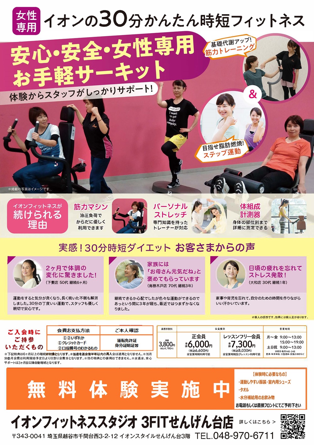 イオンフィットネススタジオせんげん台店は、2階から3階に移動しリニューアルいたしました。女性専用30分サーキットトレーニングでかんたんに安心して運動していただけます。