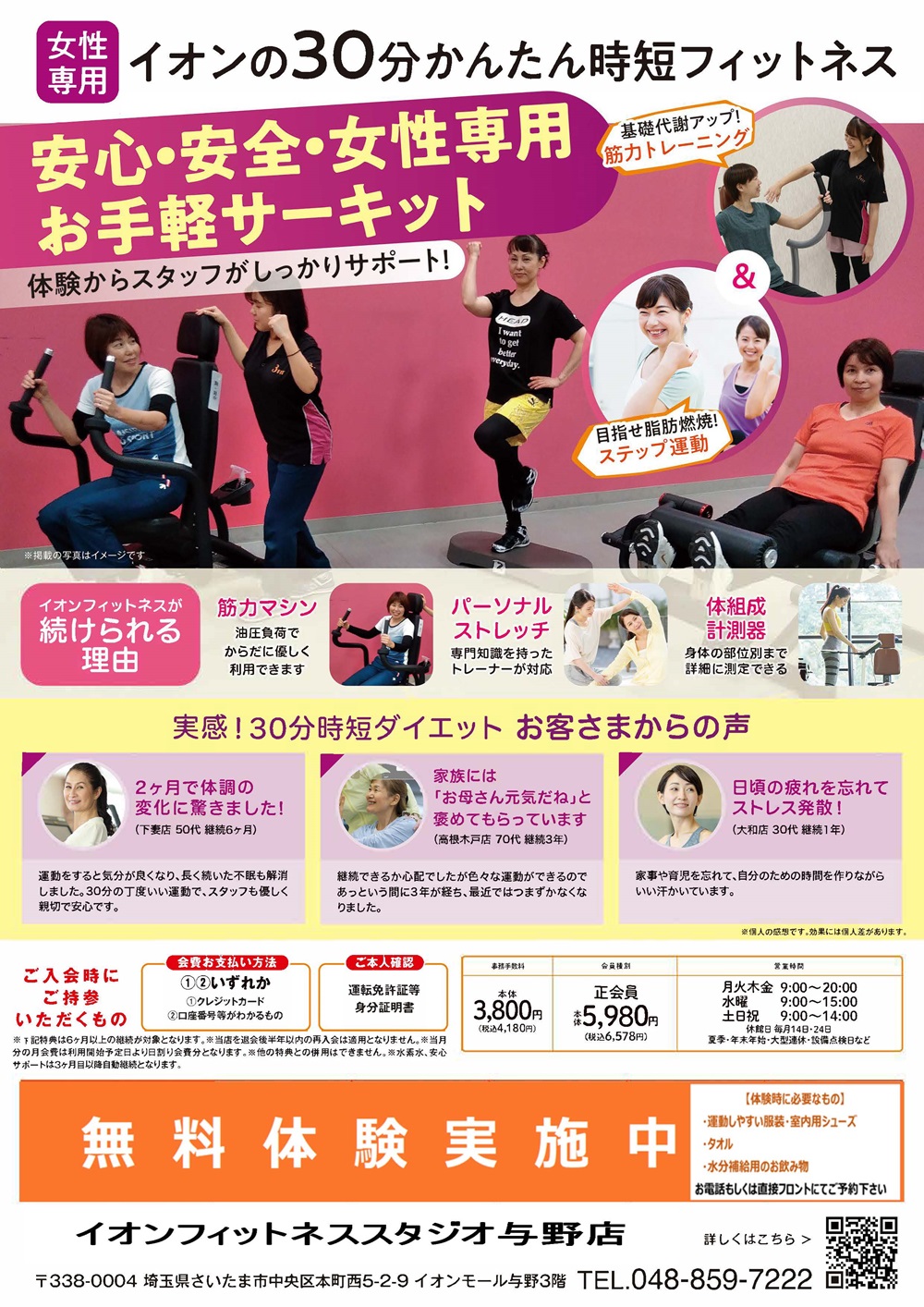 イオンフィットネススタジオ 与野店はイオンモール与野内にある初心者でも安心して気軽に行える女性専用の30分サーキットトレーニングスタジオです。
