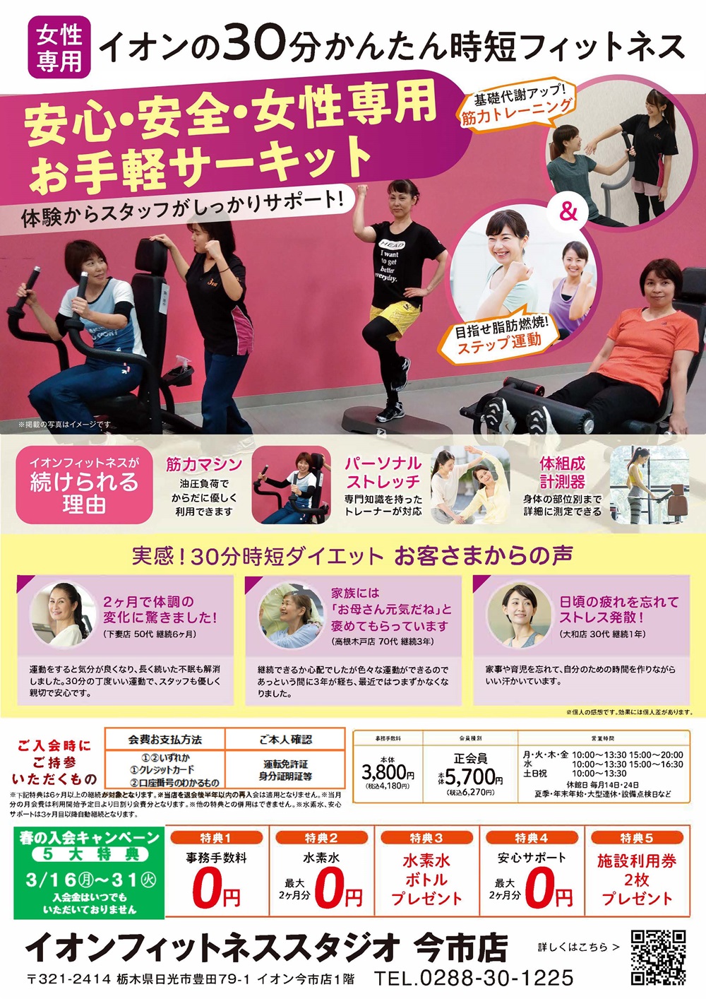 イオンフィットネススタジオ 今市店はイオン今市店内にある初心者でも安心して気軽に行える女性専用の30分サーキットトレーニングスタジオです。