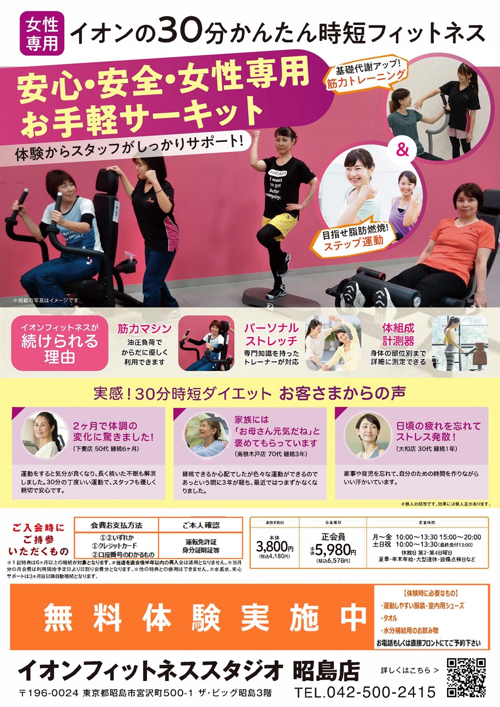 イオンフィットネススタジオ 昭島店はザ・ビッグ昭島店内にある初心者でも安心して気軽に行える女性専用の30分サーキットトレーニングスタジオです。