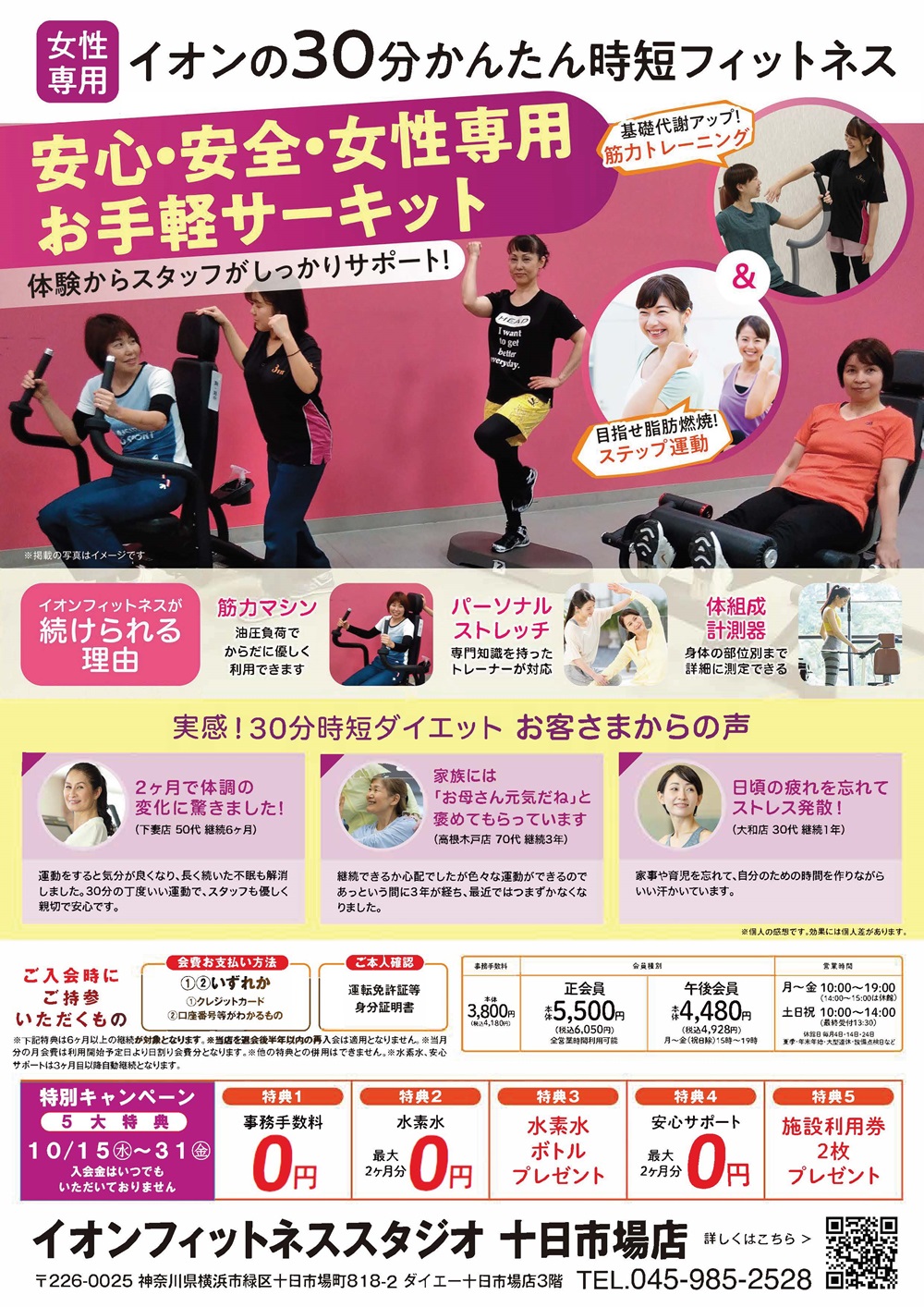 イオンフィットネススタジオ 3FIT 十日市場店はダイエー十日市場店内にある初心者でも安心して気軽に行える女性専用の30分サーキットトレーニングスタジオです。